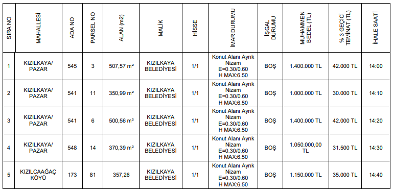 1- Belediyemize ait imarlı, müstakil bulunan ve aşağıda taşınmaz bilgileri bulunan muammen bedeli yazılı 5 adet taşınmaz arsa satılmak üzere 2886 Sayılı Kanunun 45. maddesi gereğince açık artırma usulünden ihaleye çıkarılmıştır.